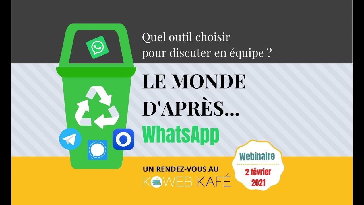 Un petit message de rappel suite à votre inscription au webinaire LE MONDE D’APRÈS… WHATSAPP - Quel outil choisir pour discuter en équipe. Nous nous retrouvons demain, mardi 2 février de 18h à 19h (19h30 pour ceux qui voudront discuter un peu plus) sur Zoom.